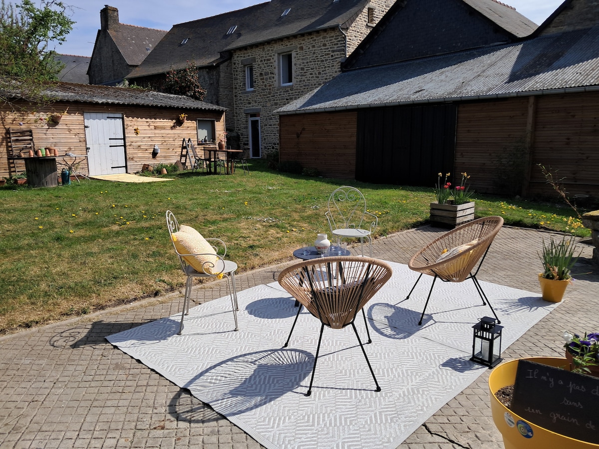 Arrivée autonome, digicode portail + boîte à clé, horaire d'arrivée à définir. Cour commune. 1 place de park. sécurisée devant la location. Entrée verdoyante privée, maison adaptée pour pers. seule ou couple, chambre séparée lit 160x200. Commerces à 1 mn à pied (boulang., tabac, presse, épicerie... ouverts dim. matin). Proche Chât. Rocher Portail (3mn), A84 (5mn), Avranches, Rennes, Fougères, Mt St Michel (30mn)... Linges lit+toilette inclus. Ménage non inclus dans le tarif, à faire avant départ