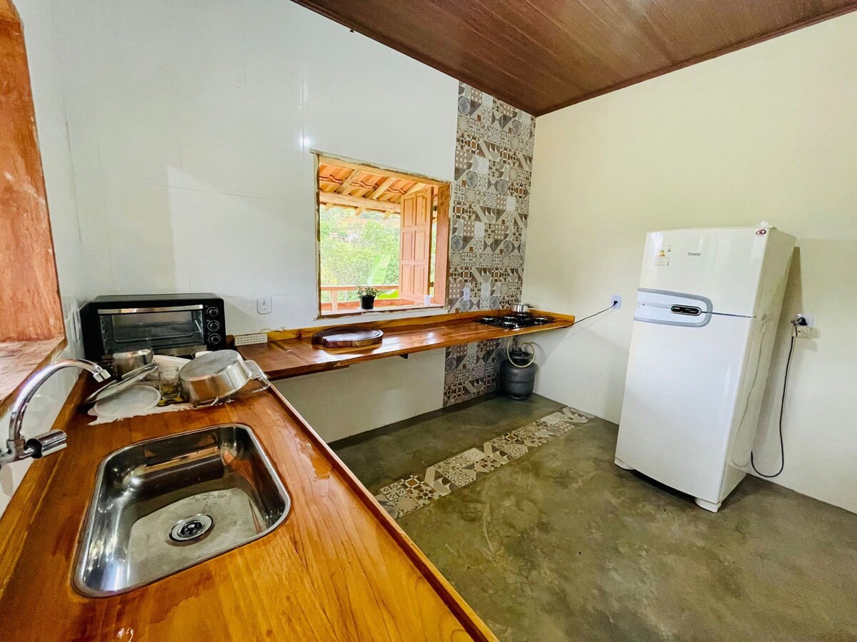 Esta es mi casita en Tabuleiro, distrito de Conceição do Mato Dentro. Ofrezco dos suites para fines de semana y temporadas. Se encuentran en la parte inferior de la casa, con entrada independiente y un balcón con vista frontal a la Serra y Cachoeira do Tabuleiro. En la primera suite, la cama es doble y tiene baño privado. Entre las dos, tenemos una minicocina, equipada con nevera, encimera con fregadero, microondas y cocina eléctrica. En la segunda, hay dos camas individuales y baño privado.