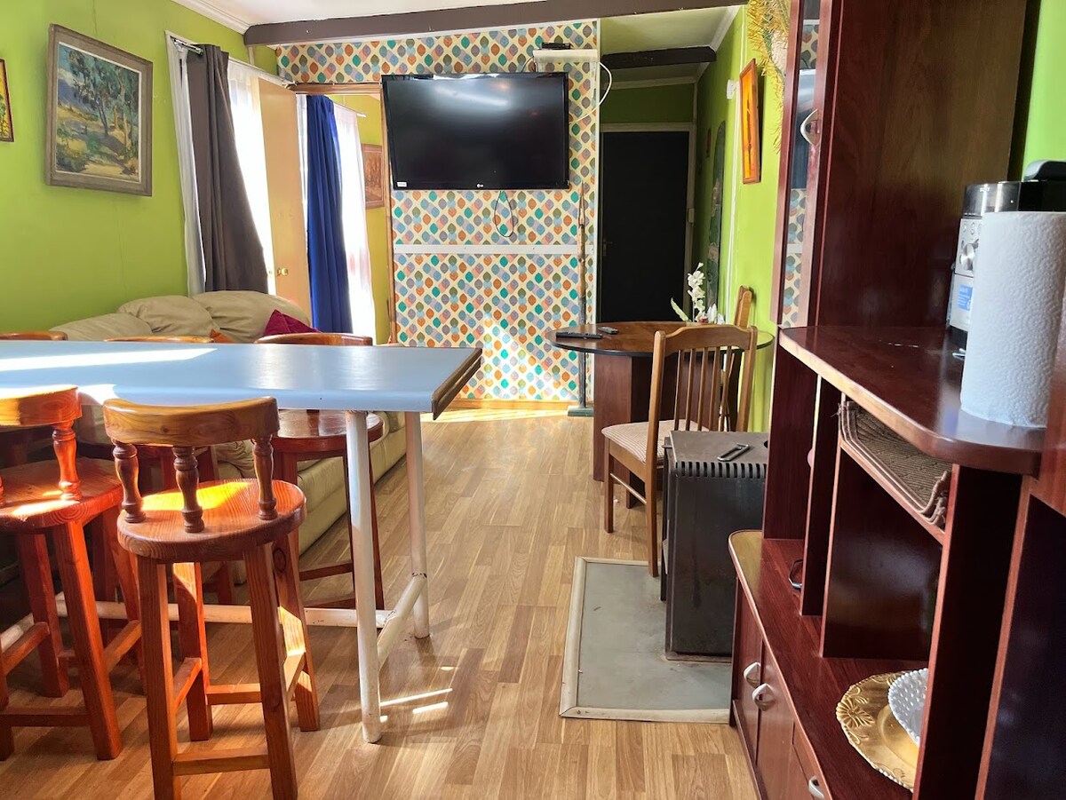 Departamento con dos habitaciones con cama de 1 plaza, ambas con escritorio e iluminacion natural. Cuanta con cocina y zona de comedor, baño independiente. Lugar tranquilo con locomoción colectiva a la puerta a cualquier destino de la ciudad, cercano a mall, parques, aeropuerto y zonas de servicios.