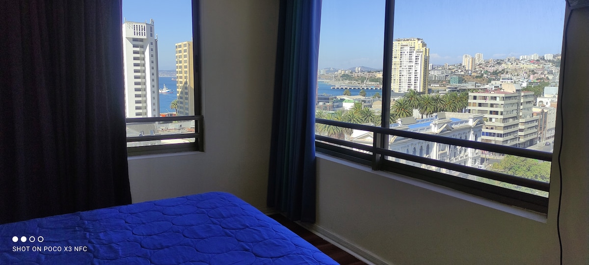 Estiloso y amplio departamento de concepto abierto en cocina/comedor/living, ideal para poder compartir en familia o con amigos y disfrutar de la hermosa vista de la bahía. Esta ubicado en el corazón de la ciudad, a pasos Estación de Metro Puerto, Muelle Prat, Plaza Sotomayor, ascensor el peral, reloj Turri, perfecto para conocer caminando la ciudad y sus hermosos cerros. Vista privilegiada para ver los fuegos artificiales desde el balcón o dormitorio (piso 10) frente al puerto.