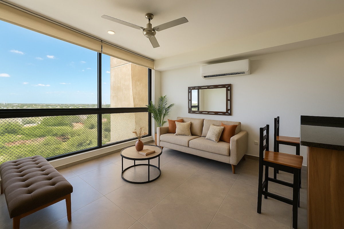 Bienvenido a tu refugio en Temozón Norte, una de las zonas de mayor crecimiento en Mérida, que aún conserva su tranquilidad y entorno natural. Nuestro departamento de una habitación es ideal para descansar y disfrutar: cuenta con cama king size, closet, baño privado y un cómodo sofá cama matrimonial en la sala para huéspedes adicionales. Disfruta de tu propia piscina privada en la terraza o aprovecha las amenidades del edificio como el gimnasio, piscina común, pet park y salón de eventos.