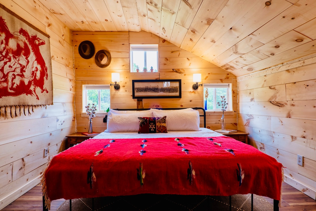 Nuestro granero se encuentra en un gran campo en el lote junto a nuestra vivienda. Nuestra área de alquiler está arriba, lo que ofrece vistas preciosas de nuestro campo y de los ciervos visitantes. La decoración ecléctica se acumula a partir de años de activismo. Nuestra habitación y baño están recién reformados. Es una zona tranquila cerca de dos parques estatales. Operamos un negocio de pedidos por correo en el área de abajo, pero no trabajaremos mientras los huéspedes se hospedan con nosotros.
