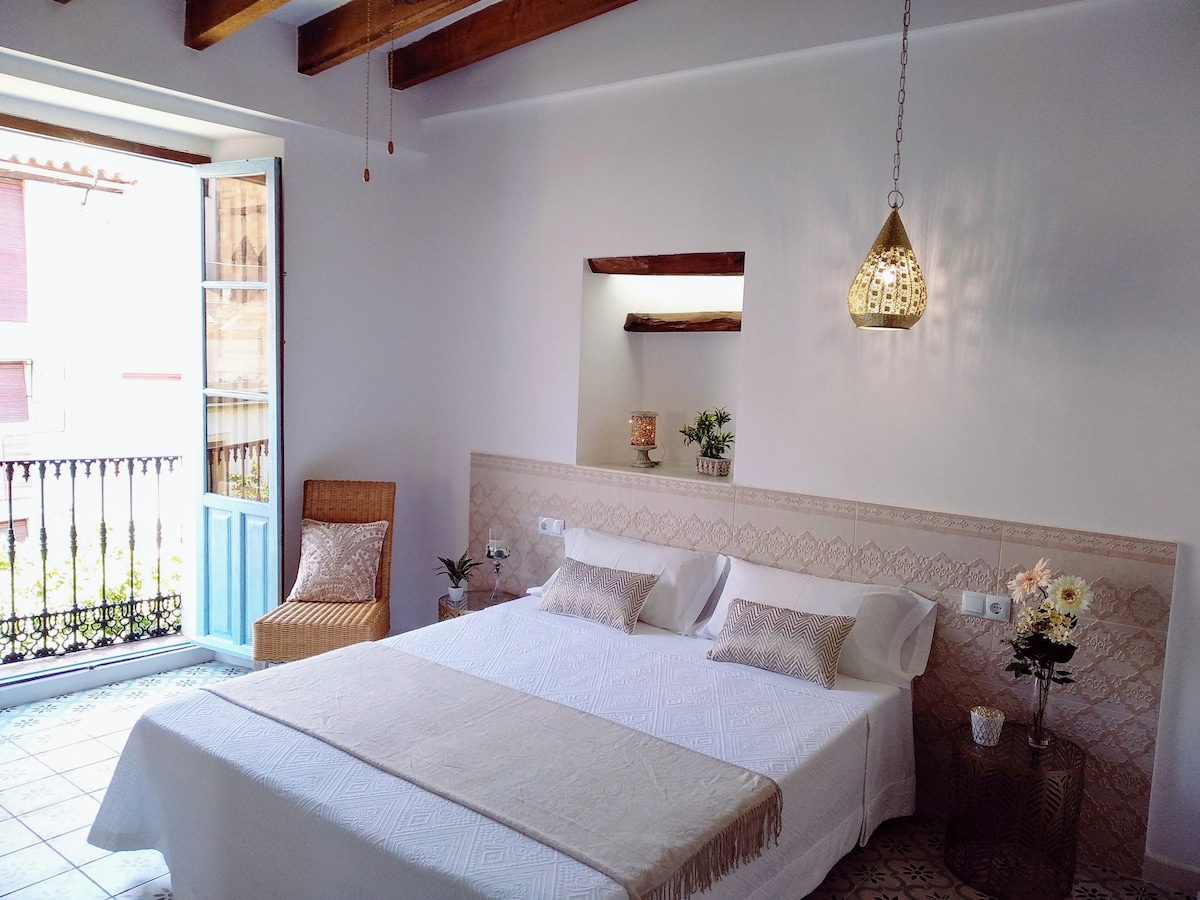En la primera planta de esta casa cordobesa se encuentra un alojamiento, ideal para parejas, decorado con estilo árabe, romántico y mediterráneo, con un espacioso dormitorio con cama tamaño Queen-Size (160x200). Relájate en sus balcones, desde los que disfrutarás de las maravillosas vistas de una de las calles más emblemáticas de la ciudad, a menos de 5 minutos de la Mezquita. Disfruta de su peculiar estilo diáfano, todo comunicado y sin puertas (excepto en el aseo), con arcos estilo árabe.