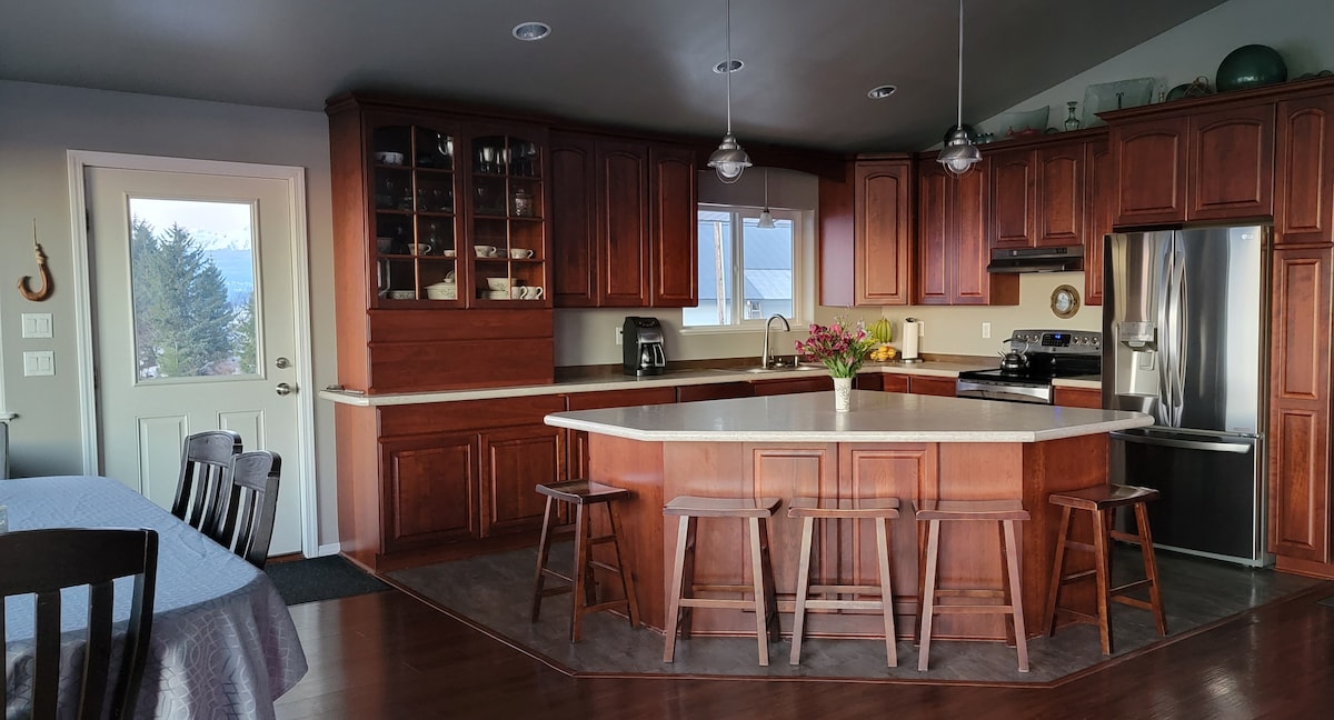 Relax with breathtaking 360-degree Eyak lake and mountain views in the beautiful Cordova. This private retreat offers the perfect balance of comfort and adventure, just minutes from town and ideal for your Alaskan getaway. This is a spacious two story 3 bedroom, 2 bath unit. The upstairs features 2 queen bedrooms and one bath and downstairs is a master bed and bath with a door to a back deck and hot tub. Enjoy the full stocked kitchen, two in unit washer/dryer sets and a salt water hot tub.