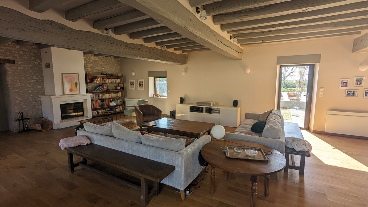 Gran casa familiar de más de 400 m² tranquila en un pequeño pueblo de Loiret, a 1 h y media de París. Accesible en transporte público (estación de tren a 8 km) Ideal para fines de semana o vacaciones con amigos/familia. Tan agradable en verano con piscina, cancha de petanca, hamaca, mesa de ping pong, jardín, terraza, barbacoa como en invierno con chimenea y estufa, pinball, máquina de «arcade», proyector.