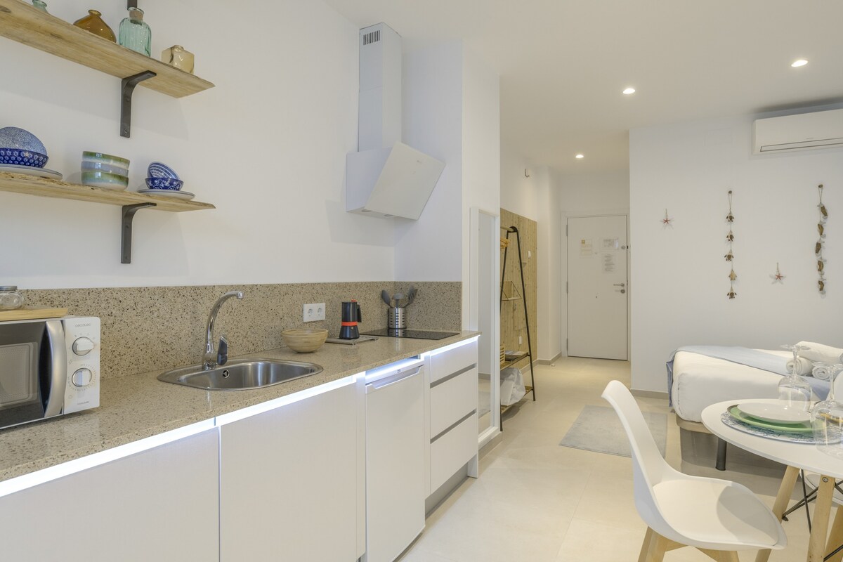 Magnífico estudio en edificio de construcción reciente. Muy luminoso, acogedor, práctico y limpio, con una moderna decoración y totalmente equipado. Ubicado en un barrio tranquilo, cerca del centro y de la playa, es ideal para unas vacaciones relajantes, sin estrés y con todas las comodidades necesarias. Ofrecemos servicio de piscina en la azotea durante la temporada de abril a octubre.