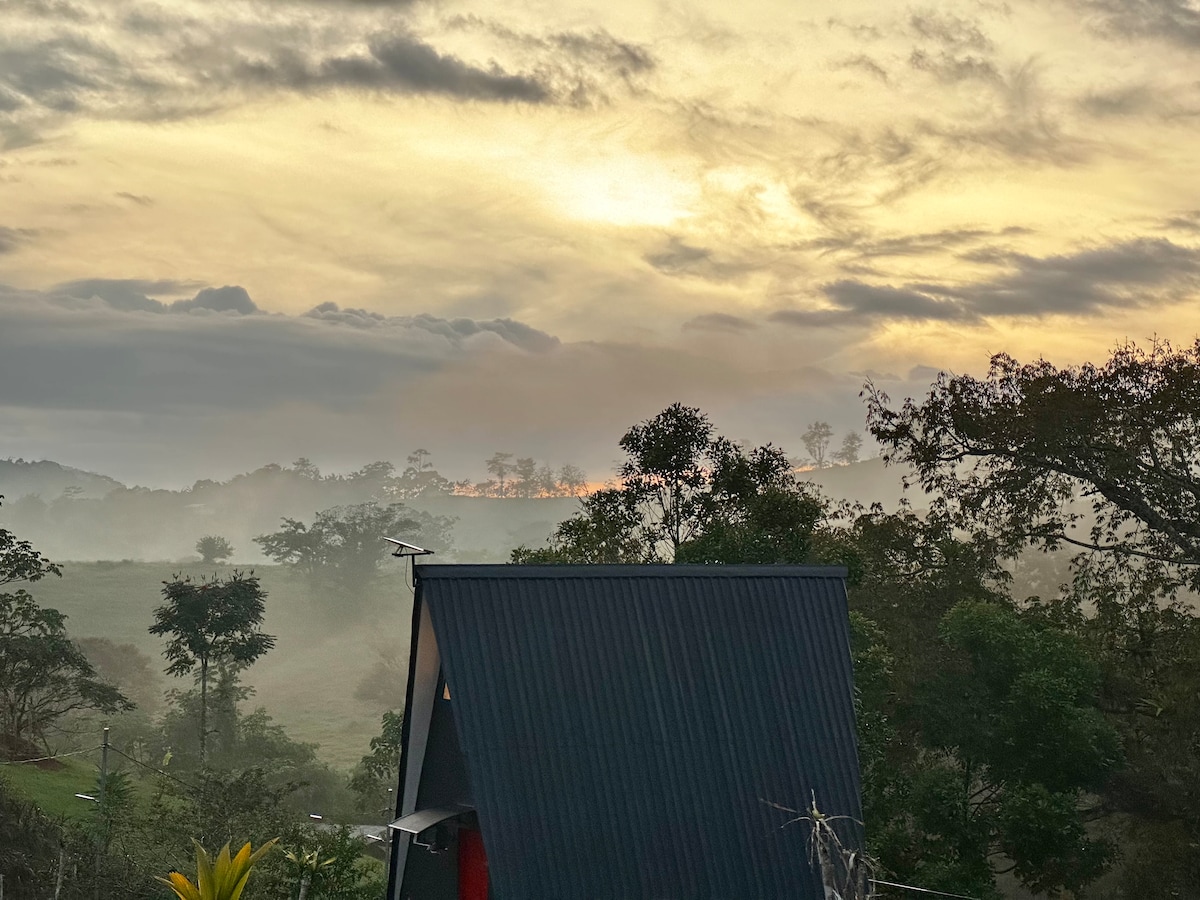 A Frame House es un refugio único en la montaña con privacidad total, vistas al mar y montañas, atardeceres mágicos y noches estrelladas. Disfruta de una finca privada, sala con TV y juegos, cocina equipada, comedor, habitación y terraza panorámica. A 15 minutos de Monteverde. Un escape perfecto para desconectar y conectar con la naturaleza. Reglas: Check-in: 3:00 p.m. Check-out: 11:00 a.m. No ruido después de las 10 p.m. No fumar dentro. ¡Reserva y vive la magia!