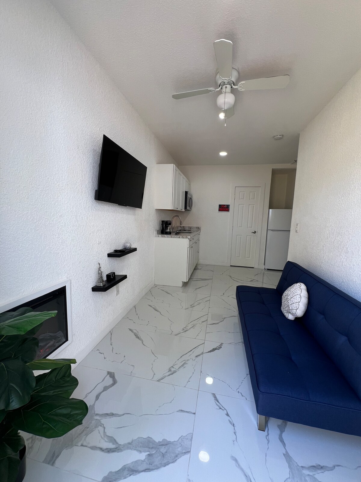 Este es un refugio moderno de mediados de siglo recién reformado en el corazón de Pembroke Pines. Este cómodo estudio es ideal para estancias cortas, con una cocina completa, un baño bellamente actualizado y una amplia sala de estar. Relájate en una cómoda cama tamaño queen y un futón que se abre a una cama doble. Incluye café de cortesía, artículos de aseo, wifi rápido y un televisor inteligente con aplicaciones de streaming. Sumérgete en la comodidad y el estilo en este acogedor espacio en la vibrante Pembroke Pines.