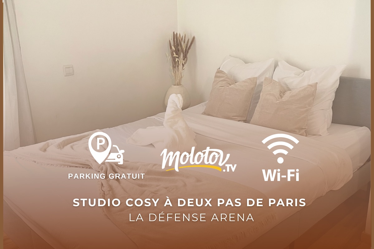 Appartement calme et sans vis-à-vis proche de La Défense Arena (200m à pied). Moderne, spacieux et lumineux, ce logement est idéalement situé pour les événements, visites ou séjours professionnels. • 3 personnes max (Lit queen size et canapé) • Wi-Fi gratuit, cuisine américaine équipée, lave-linge/sèche-linge et lave-vaisselle. • À 5 min à pied du RER A et E. À 10min à pied de La Défense (RER A, E, L, U, T2, M1) Profitez de l’emplacement pour effectuer vos déplacements en toute simplicité !