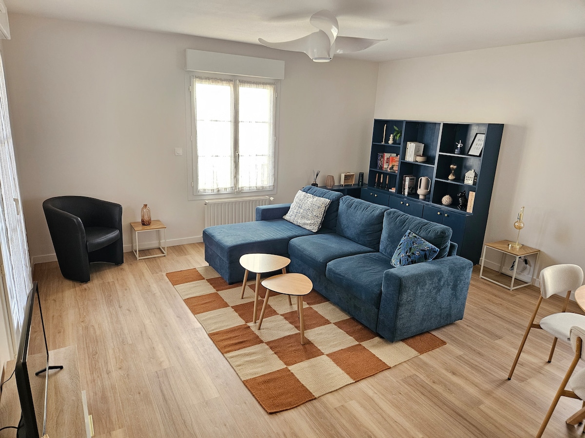 ¡Bienvenido a tu remanso de paz, su ubicación y sus activos serán una ventaja para tu estancia! Este alojamiento tranquilo ofrece una estancia relajante para toda la familia. En una calle tranquila con aparcamiento gratuito y fácil, podrá disfrutar de las zonas exteriores con su gran terraza. Dispondrá de: > un dormitorio con una cama doble de 140, > una sala de estar con un sofá de esquina convertible en cama doble, > una cocina amueblada y equipada > un baño > un aseo.