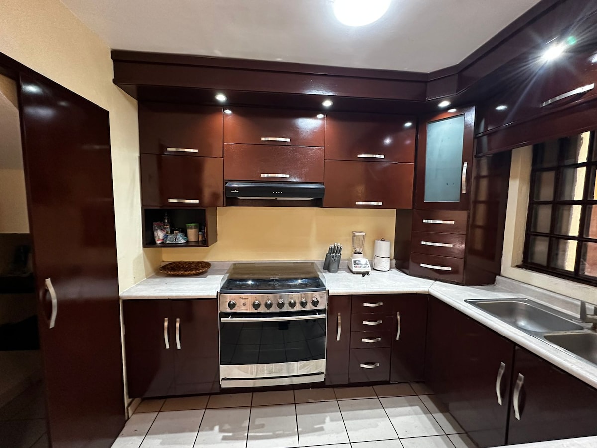 Relájate en este espacio tranquilo y elegante, ideal para pasar unos días de descanso. Con alberca privada climatizada ( 30 a 32 grados), relajante jardín, terraza abierta, cocineta y asador esta completamente equipada. Cuenta con 2 recamaras con un excelente diseño y preparadas para que disfrutes de un descanso placentero, con cama King en la principal y Queen en la segunda recamara ✔ Minisplit en ambas recamaras. ✔ Mini enfriador en recamara principal ✔ Internet en toda la casa de 500 Megas
