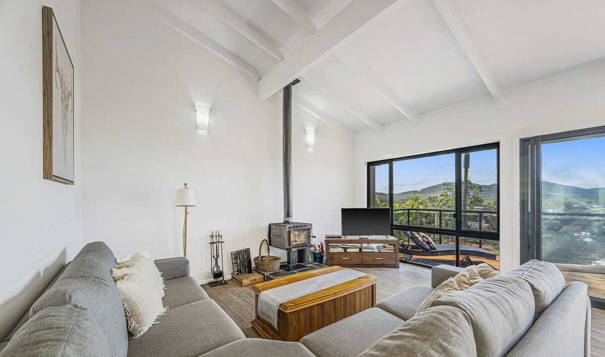 A spacious cabin in a rural setting with magnificent views of the Never Never range. There is a king bed, quality linens and a claw foot bath. A wood fire for colder evenings and air-con for hot days. Walk to the river and forest. This is private and inspiring accomodation 10 mins from Bellingen, a perfect retreat. Organic muesli and fruit provided for breakfast.