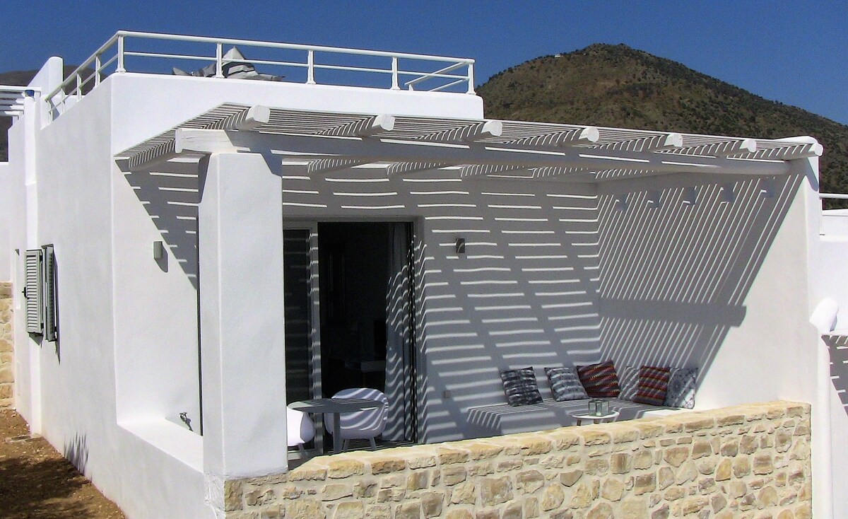 Las villas Vlamis constan de 4 apartamentos adyacentes y uno separado, la Junior Villa. La villa fue renovada en 2023. El diseño se basa en geometrías limpias y materiales naturales en tonos claros. Se utilizaron materiales como la madera y la tela, combinados con estilos en tonos pastel, para crear un ambiente acogedor y tranquilo para los huéspedes. Se hizo hincapié en el estudio de la iluminación para combinar diferentes calidades de iluminación a lo largo del día.