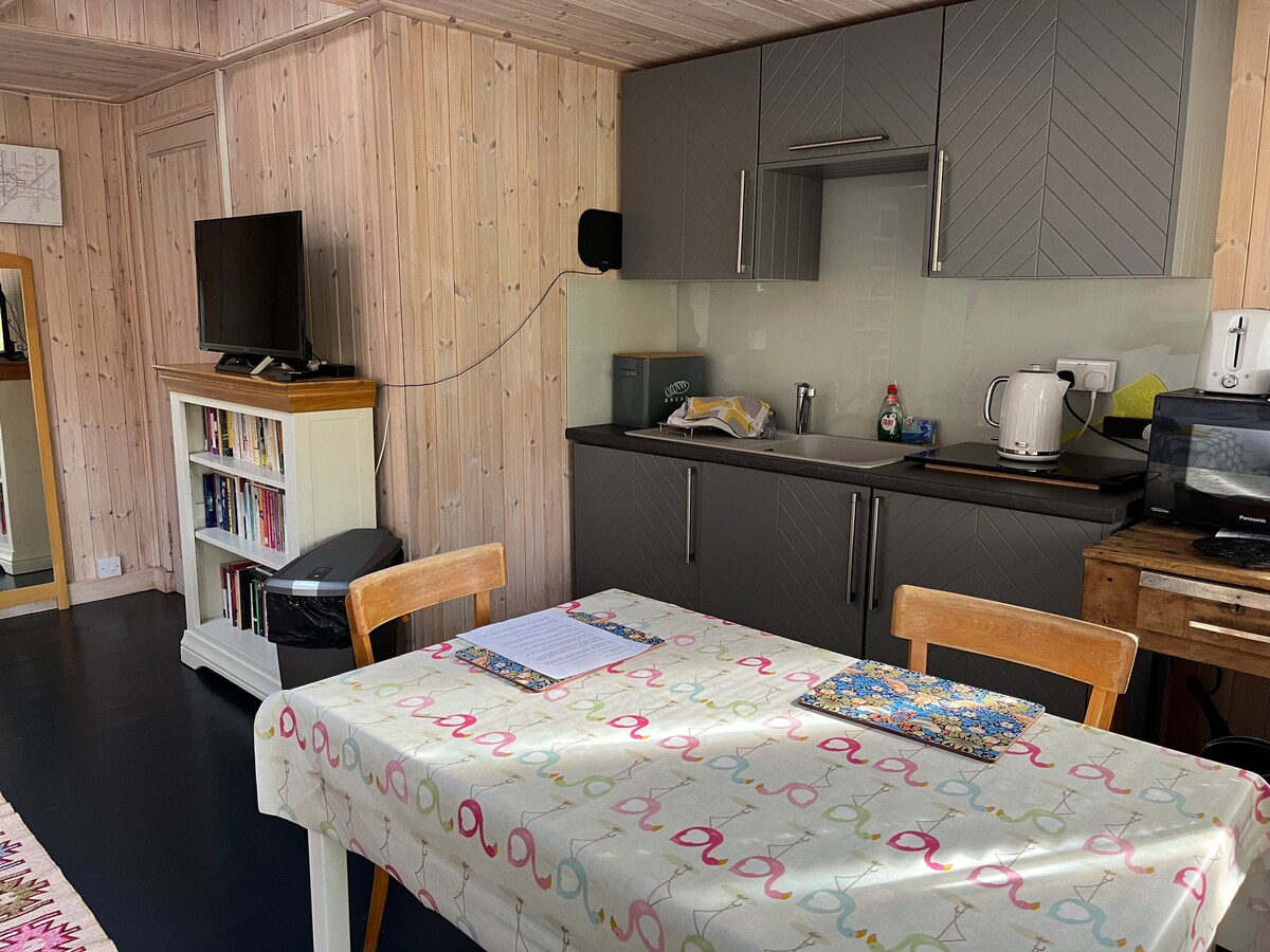 Bienvenido a nuestra acogedora cabaña única y con buen gusto, donde la comodidad y la tranquilidad se encuentran. Ubicada en la parte trasera de nuestro jardín, esta cabaña ofrece un ambiente sereno perfecto para un máximo de dos huéspedes. Con su propia entrada privada, completa con cerraduras y llaves codificadas. Cocina americana totalmente equipada con placa de inducción, microondas, tostadora, hervidor, nevera-congelador, lavadora, wifi, TV inteligente. Ideal para aquellos que buscan un retiro tranquilo, que viajan por negocios, lugares de interés y eventos.