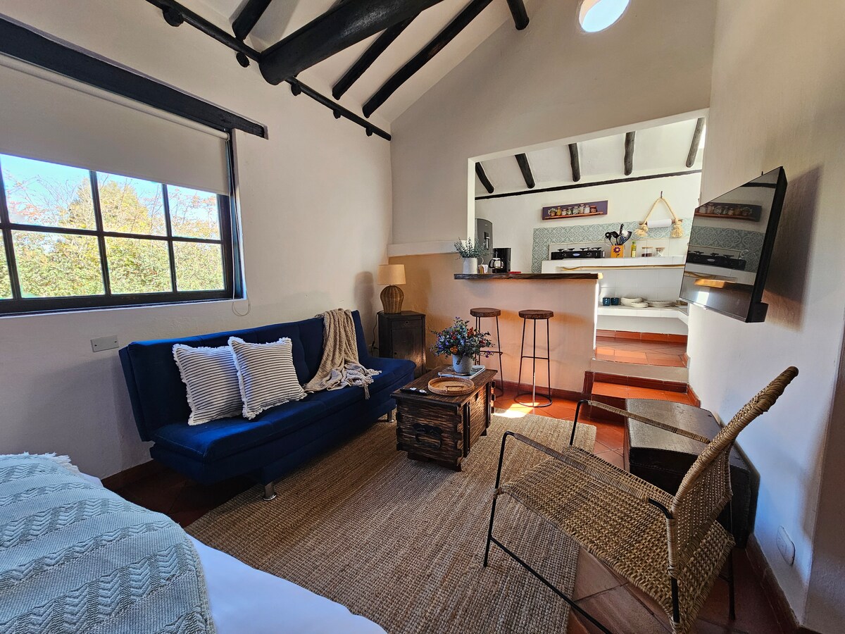 Suite Campestre con vistas increibles a la montaña, Disfruta de naturaleza, relax y confort. Acceso independiente. Zona Coworking, Excelente WIFI. Consta de 1 amplia habitacion 1 cama matrimonial y 1 cama semi-doble. Balcon interno, Baño privado, TV Netflix, Area social con comedor exterior. Zona BBQ Zona para fogatas. Su mascota es bienvenida! Ubicacion semi-rural a tan solo 4 kms de Plaza Principal. Amplio estacionamiento privado sin costo. Excelente Wifi fibra optica Espacio para trabajar