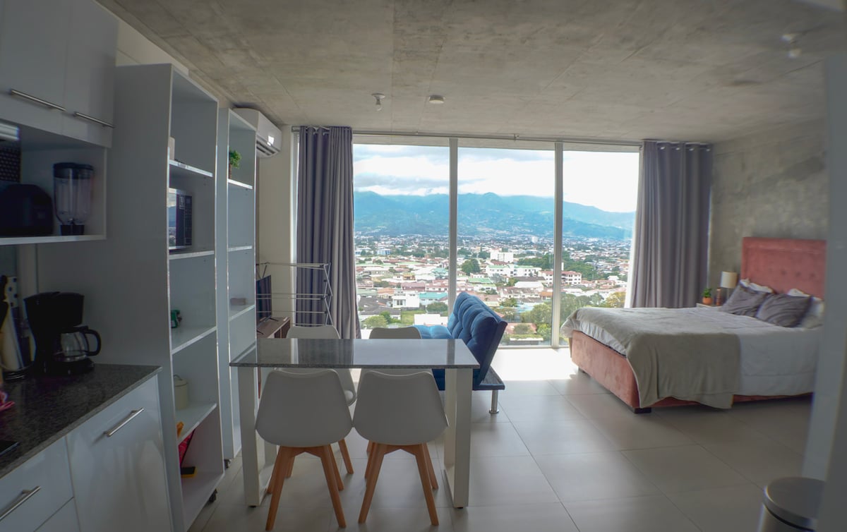 El espacio es muy cómodo ya que está equipado con utensilios de cocina, mesa de trabajo, wifi, tv, aire acondicionado, sillón individual, sillón para dos personas, estantes, closets, etc que lo hacen muy acogedor. Además cuenta con un balcón con puertas corredizas que permite disfrutar de hermosas vistas hacia San José y montañas, atardeceres increíbles y aire fresco. La mayor parte de las calificaciones destacan la limpieza del espacio, algo que particularmente nos preocupamos en ofrecer.