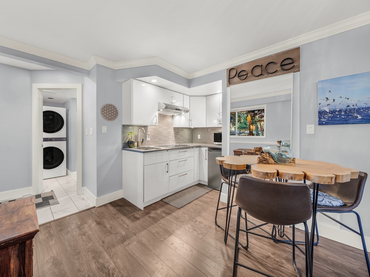 A los huéspedes les encanta nuestro 5 % de alojamientos más destacados: impecablemente limpios, con un diseño precioso e increíblemente cómodos. Suite estilo boutique con techos altos, una lujosa cama king y una comodidad superior a la de una estadía en hotel. Disfrute de una sala de estar soleada, lavandería en la suite, Wi-Fi de 1 G, televisor inteligente de 52 pulgadas con Netflix, café y té gratuitos, entrada privada y estacionamiento gratuito. Calefacción por termostato y enfriamiento natural en verano. A poca distancia a pie de paradas de transporte público, parques y senderos; a poca distancia en auto de tiendas. Ideal para parejas, familias, viajeros solos o estancias de negocios.