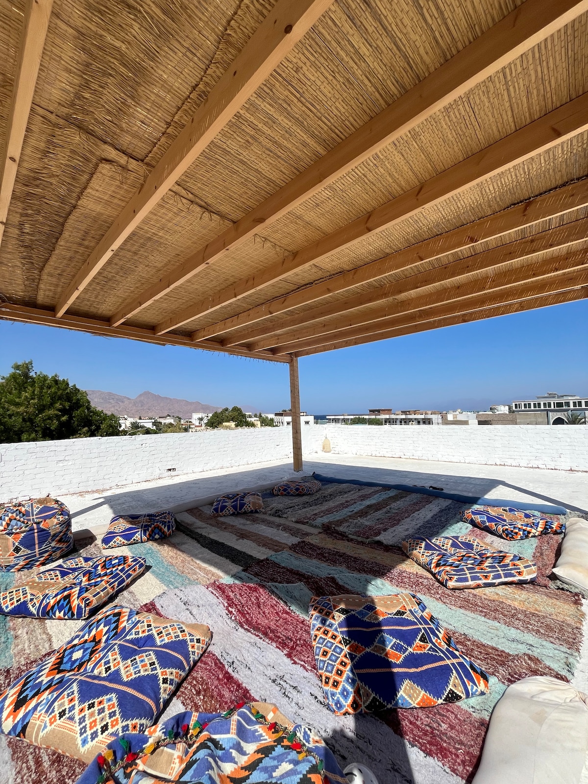 Tucked away in a quiet local neighborhood, this hidden Dahab gem offers comfort and privacy with a true sense of retreat, while still being only an 8-minute walk from the lively Lighthouse area and the beach. Wake to the sound of roosters and enjoy your morning coffee in the garden. At sunset, head up to the rooftop for sweeping views of Sinai’s changing colors, then end the evening around the peaceful garden fire under a sky full of stars, with the city glowing in the distance.