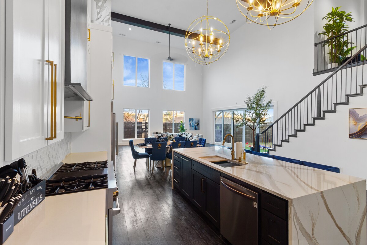 ¡Sin tarifas de limpieza! ¡Impresionante casa con techos altos a solo 3 millas del centro! Cerca del acuario, zoológico, aerolíneas americanas, parque klyde warren y todo lo que Dallas tiene para ofrecer. 6 dormitorios, 5,5 baños, 12 camas. Capacidad para 24 personas cómodamente. Casa inteligente moderna con jacuzzi (costo adicional), ping pong, hockey de aire, mesa de billar, futbolín, 9 televisores de pantalla grande, incluida una sala de cine con Samsung QLED de 98"con sonido envolvente Dolby Atmos. También tiene patio, parrilla de carbón, cornhole, jenga, connect 4, shuffleboard y cocina completa.