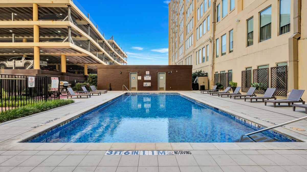 ¡Te damos la bienvenida a tu retiro en el centro de Dallas, Texas! Perfectamente ubicado en el corazón de la ciudad, este apartamento es ideal para viajes de negocios, visitas turísticas o una escapada relajante. Con 5 camas cómodas con capacidad para hasta 11 huéspedes, el espacio está diseñado para grupos de cualquier tamaño. Disfruta de un departamento totalmente equipado junto con las comodidades del edificio que hacen que tu estancia sea cómoda y agradable. ☀ Piscina ☀ Gimnasio ☀ Cine ☀ Sala de juegos Sala ☀ de arte ☀ Se admiten mascotas ☀ Servicio de estacionamiento.