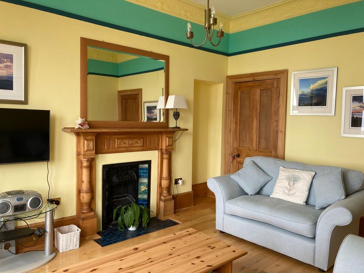 Alojamiento 2/3 Apartamento independiente adyacente a la casa principal con entrada propia, en primera línea de mar en el centro de Dunoon, con impresionantes vistas al Clyde y hasta Cumbrae, Bute y Arran. A 1/4 de milla del ferry de pasajeros y a una milla y media del ferry de coches Hunter's Quay, a 5/10 minutos a pie de tiendas, cine y restaurantes. Camina, pedalea, navega en kayak, nada. Salón/estudio lleno de libros con sofá cama, dormitorio doble, cocina, baño con ducha, acceso al jardín trasero seguro con estanque de peces. Se admiten perros si son amigables con los míos.
