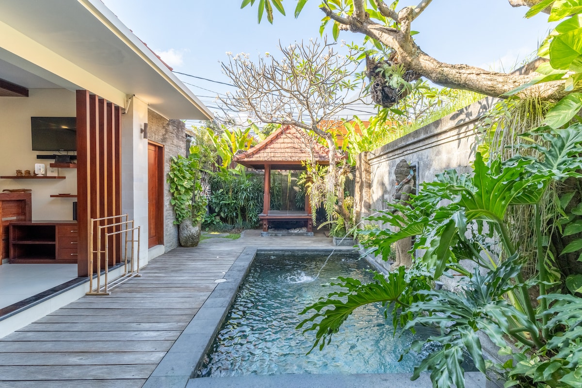 Enjoy your romantic private times in a luxurious complex, close to a fine selection of world-class cafes, restaurants and beach clubs. But perfectly hidden in a serene and quiet villa neighbourhood. This villa features an ensuite bathtub and offers a perfect dip-in pool. Enjoy your floating breakfast under the wood panels with sunlight gently pouring through. Chillax on the bean bag or sun loungers at your choice while soaking up the view of the garden.
