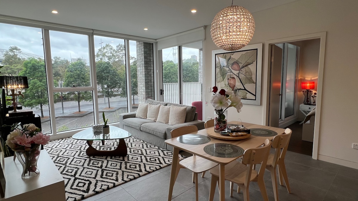 ¡Elegante apartamento de 2 camas a solo 50 metros del estadio Accor! Disfruta de una comodidad inigualable en los principales lugares del Parque Olímpico de Sídney. Evita el tráfico de eventos y las molestias de estacionamiento con estacionamiento encubierto gratuito en el lugar. Además, nuestras elegantes habitaciones preparan el escenario para una noche sensual, ¡perfectas para parejas que buscan una escapada romántica o una noche divertida!