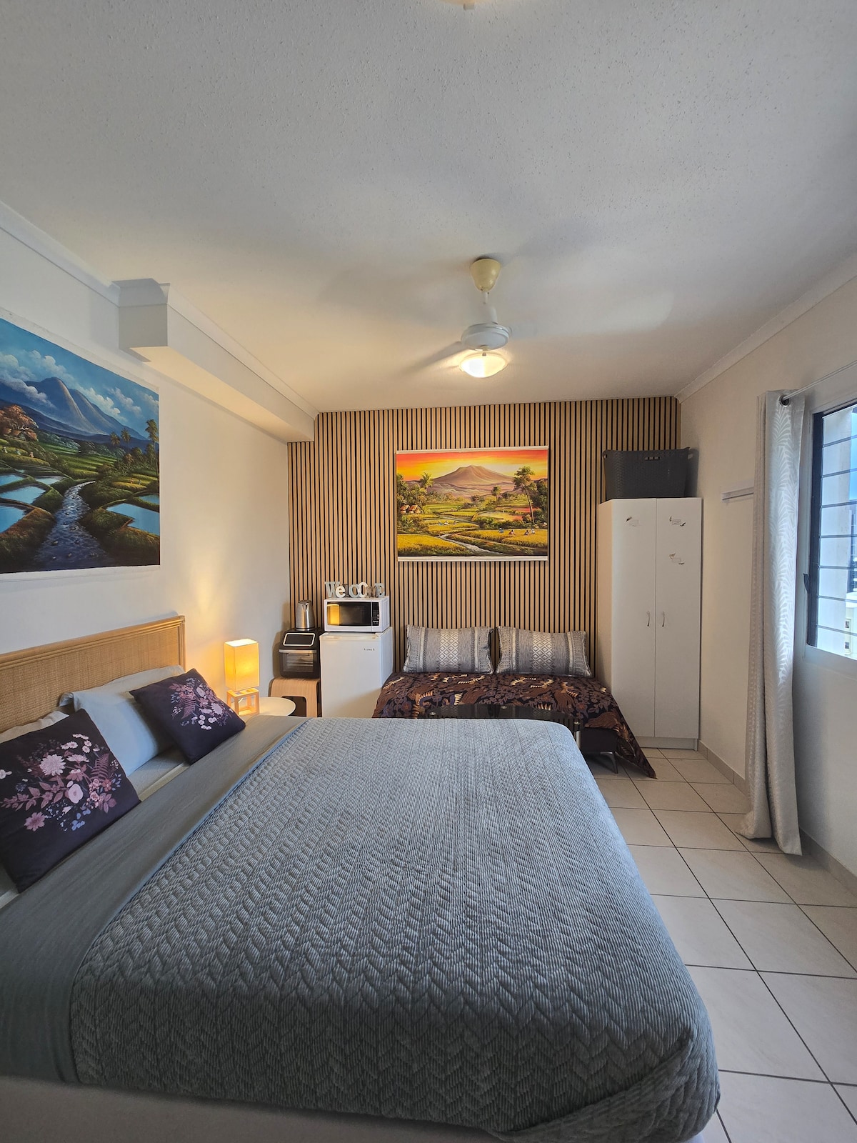 Two-bedroom apartment where guests book one private bedroom, separate from the main living area, with their own bathroom. Includes a queen-size bed, plus 1 double and 1 single bunk. No more dirty clothes—laundry and dryer provided. Enjoy privacy with your room set apart from the apartment. Relax in a furnished private rooftop oasis, perfect for sunset views. Close to restaurants and the city mall, with nearby bus and city scooter access. Ideal for couples or small families exploring the area.