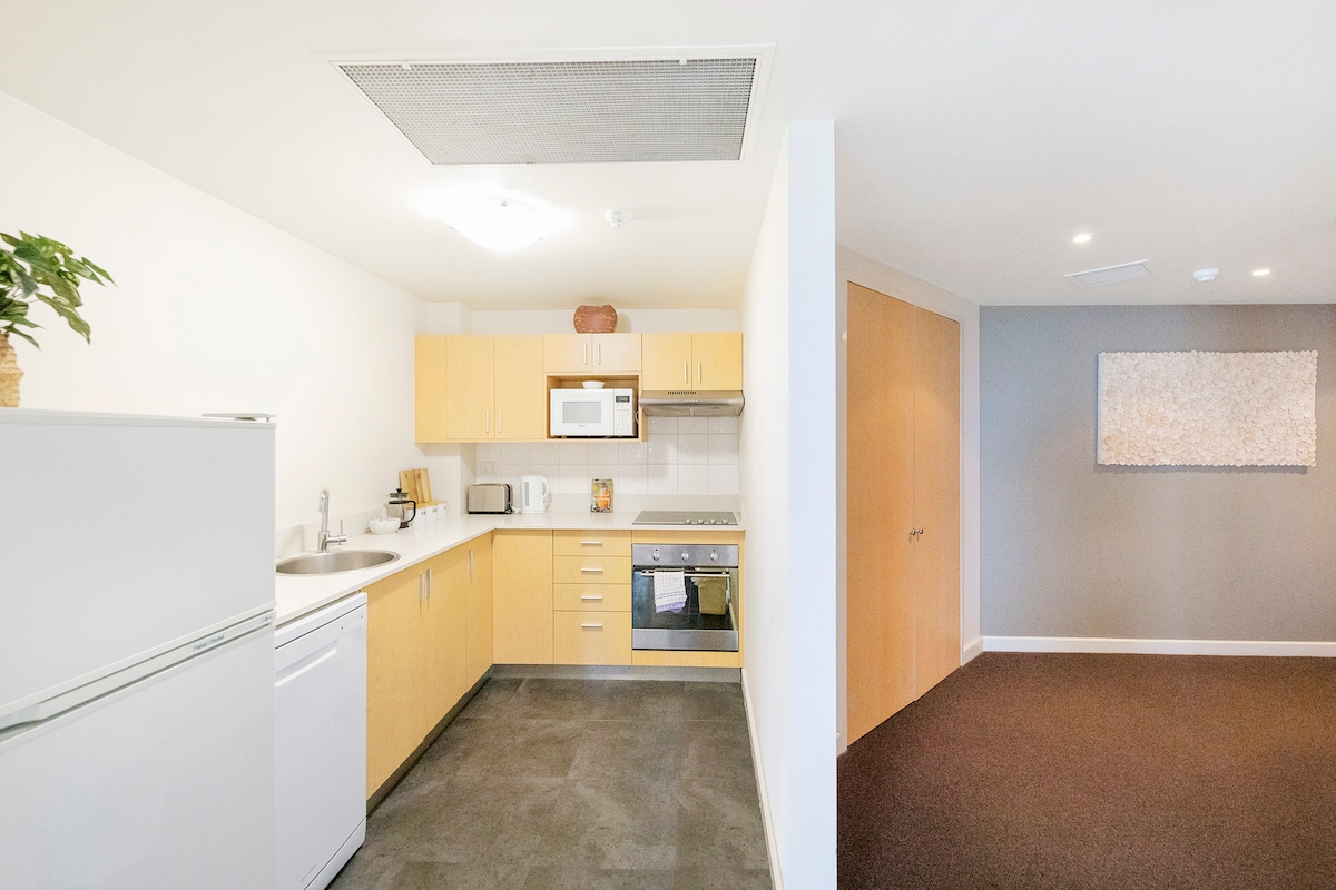 El estudio bien equipado con balcón privado está inundado de luz natural y ofrece un espacio elegante y de planta abierta para relajarse y descansar. Ofrece una cómoda cama tamaño king, calefacción/aire acondicionado controlado por el apartamento, cocina americana con encimera, nevera de bar, tostadora, hervidor de agua y microondas, baño privado con comodidades y secador de pelo, escritorio, TV LCD con Foxtel y acceso a Internet de alta velocidad. Un armario, tabla de planchar y plancha y caja fuerte privada contribuyen a la comodidad. Los huéspedes pueden acceder al gimnasio interno y a la zona de barbacoa al aire libre. Se incluye servicio diario de limpieza (sin incluir domingos ni días festivos).