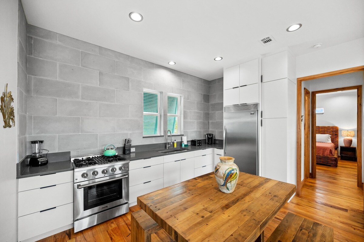 Esta casa isleña de 3 dormitorios y 2 baños de 1950 fue remodelada con un ambiente de mediados de siglo. Algunas de las características originales se han mantenido para garantizar la autenticidad. "La escapada" te sientes como si estuvieras retrocediendo en el tiempo. Es un lugar maravilloso para andar en bicicleta y puedes caminar al otro lado de la calle para lanzar nuestros 2 kayaks. Me encanta nuestro plano de piso y el hecho de que cada uno de los tres dormitorios sea lo suficientemente grande para un refugio privado, mientras que la cocina/sala de estar abierta es tan cómoda para que todo el grupo esté junta.