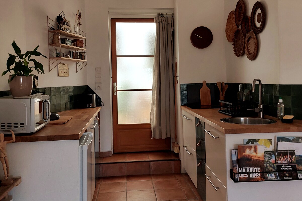 Pequeño estudio de 15 m2 equipado con una cama doble de 140 x 190, una ducha a ras de suelo, una cocina americana con nevera, un televisor. WC fuera del estudio (la puerta de al lado). Mesa plegable. Ideal para 2 personas, pero posibilidad de añadir una cuna para bebés que traerá. El estudio se encuentra en nuestro jardín con una bonita vista despejada del Vercors. Todo lo necesario «vital» a su llegada está disponible.