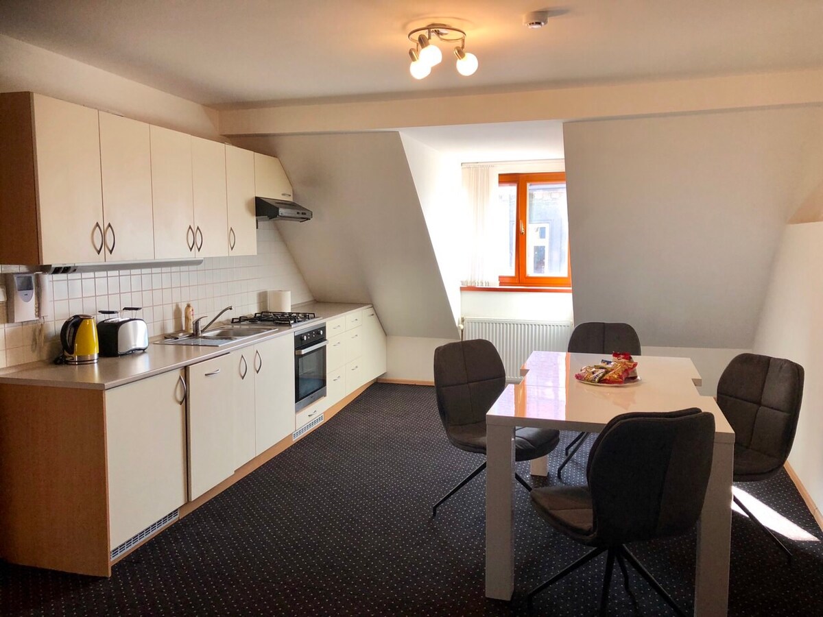 Gran lugar para el que está buscando comodidad y privacidad. El departamento está ubicado en el centro de Decin y está totalmente equipado: TV, WiFi, sofá cama para 2 personas, armarios, cocina equipada. Línea que incluye estufa, nevera, congelador, lavadora, ducha, inodoro. El apartamento tiene un balcón orientado al oeste con una hermosa vista del Elba y la Muralla del Pastor.