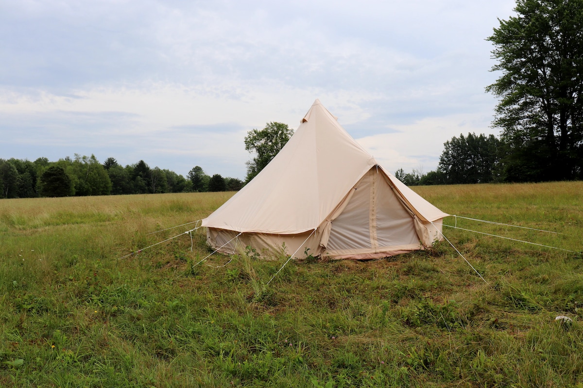 Tienda de campaña de cabaña agroforestal en Loving Farms