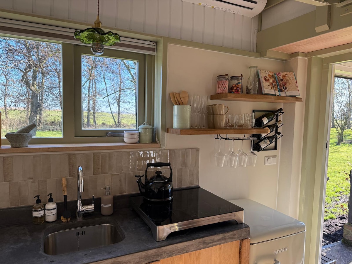 Unique accommodation in the garden of an old church. The Tiny house is small in size but large in living space! Relax on the terrace or in the forest garden. Dream away in the hot tub (optional €45 first day/€25 next days, will be stoked for you) under the stars and enjoy the silence. Wake up with sunrise and a view over the meadows. (Breakfast optional €15,- pp) Your booking is also a contribution to the renovation & conversion of this beautiful monument. Thank you!