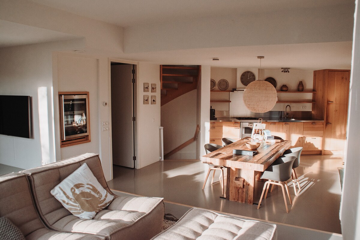 Lujoso y amplio apartamento en un granero de ovejas Texel original convertido (Boet). Espectacular vista. BnoB: el desayuno no está incluido, pero hay un supermercado cerca. Cocina totalmente equipada, baño muy espacioso con ducha a ras de suelo y dormitorio separado. El espacio total es de aprox. 65 m2. Cómoda calefacción por suelo radiante en todas partes. Wifi gratuito, TV. El boet solo tiene un apartamento que está situado en la planta baja, así que no compartirás con otros huéspedes.