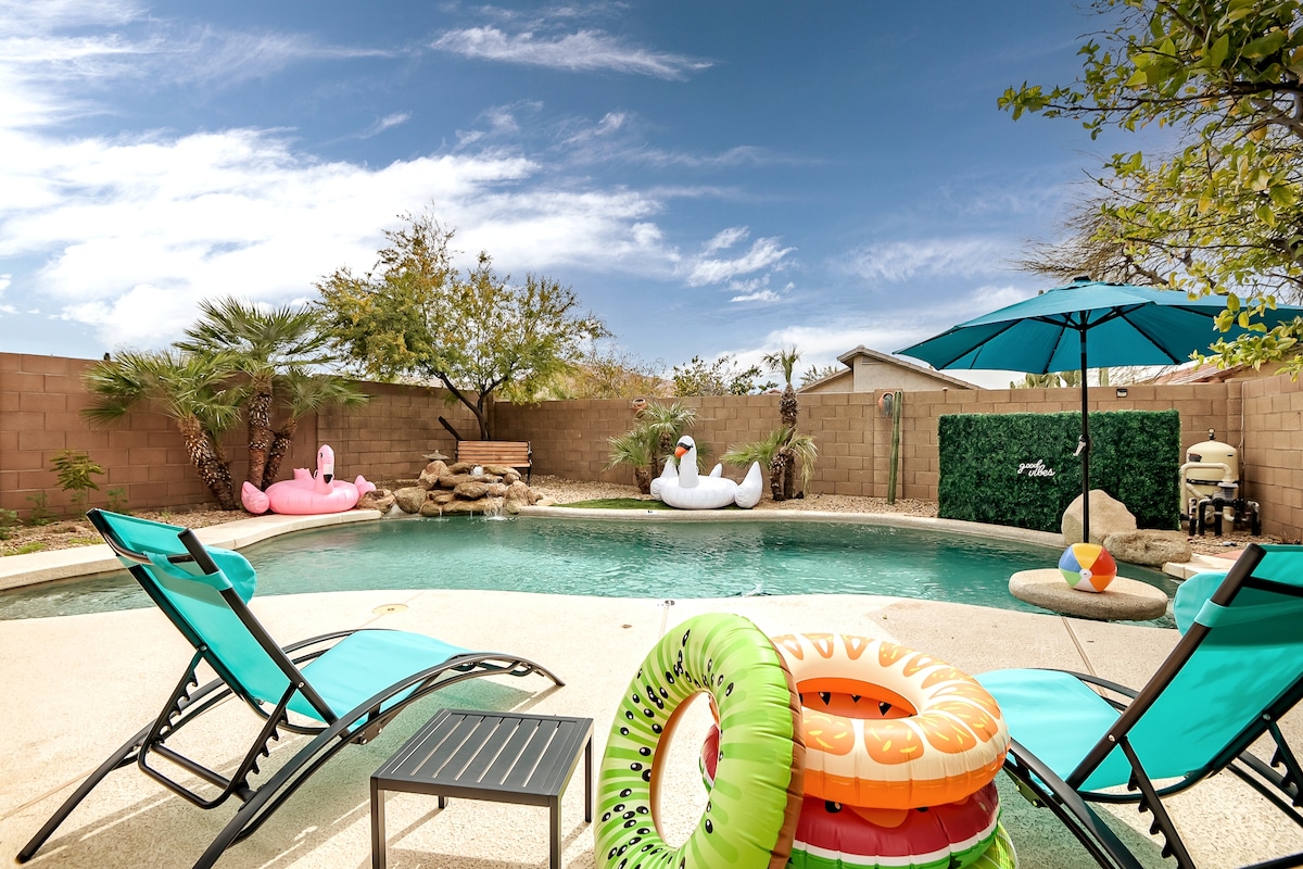 Welcome to your peaceful escape! This 3-bedroom, 2-bath home sleeps up to 8 guests and features a calming, zen-inspired interior paired with a lush, tropical backyard oasis. Step outside to enjoy a private hot tub, BBQ grill, outdoor dining area, and multiple palm trees that create a true vacation atmosphere. While the pool is not heated, the serene outdoor space and spa make it the perfect setting to unwind, and enjoy Arizona sunshine in total privacy. Your cozy, tranquil getaway awaits!