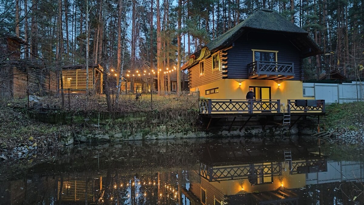 Уютный и теплый деревянный дом находится в сосновом лесу на территории коттеджного городка. Здесь можно провести выходные, каникулы или просто жить вдалеке от города посреди соснового леса. В доме есть оборудованная кухня, бытовая техника и камин. Дом окружен соснами, а река всего 10 мин пешком. Расстояние до Киева 40 мин на авто.