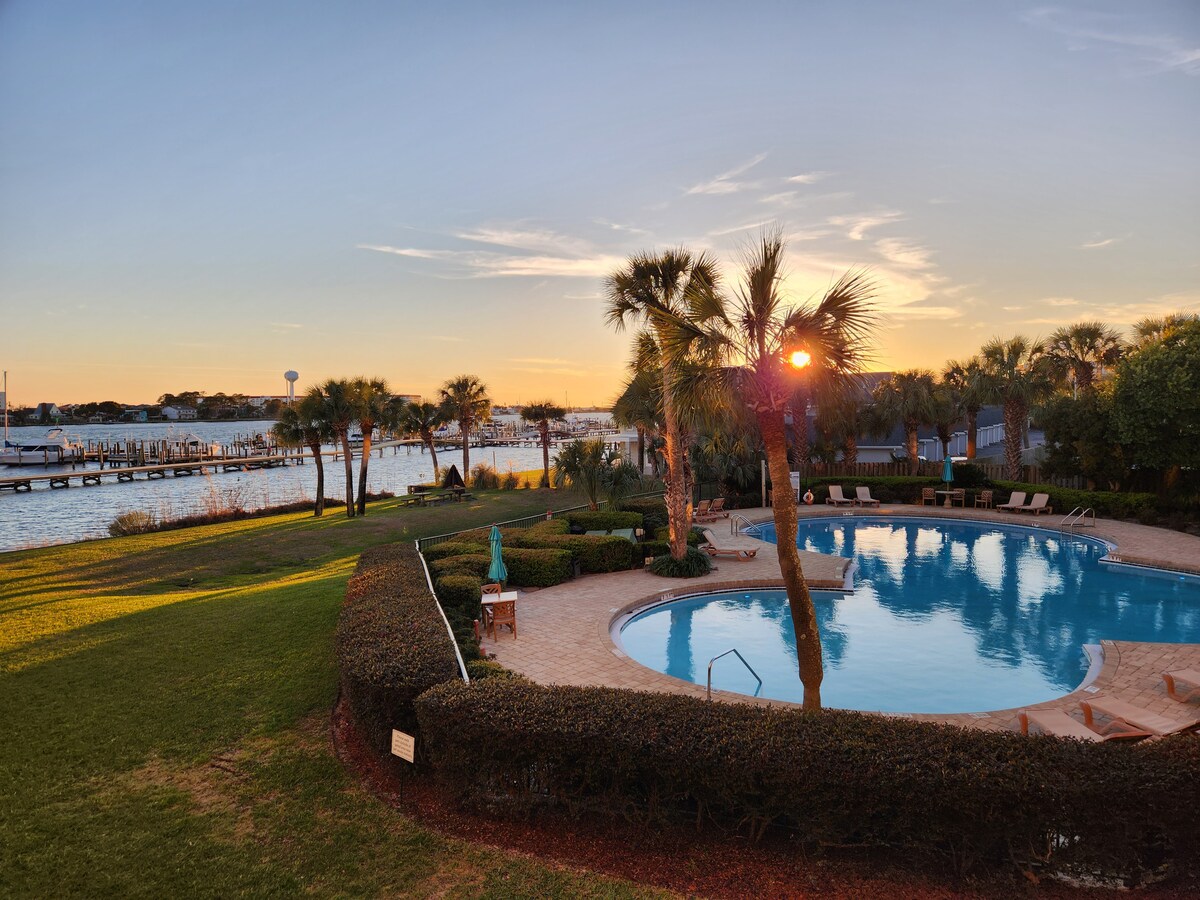 ¡Bienvenido a The Salty Pirate, tu paraíso vacacional frente al mar! Relájate en nuestro tranquilo y elegante apartamento con cama tamaño king, baño de lujo y cocina americana. Relájate en la cama, disfruta de los barcos que pasan o mira la televisión de 65 pulgadas. El balcón frente al mar te invita a leer y relajarte. Disfruta de la piscina estilo resort o reserva el kayak de 2 plazas (cuando esté disponible) para explorar la vía fluvial. ¡Los restaurantes y bares del centro de la ciudad están a poca distancia a pie y las playas de arena blanca están a 2 millas de distancia!