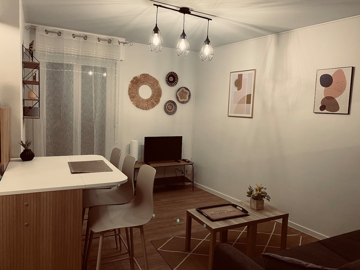 Este alojamiento tranquilo ofrece una estancia relajante para toda la familia. Alojamiento para cuatro personas recién reformado con una zona de dormitorio ( cama de 160x200 ) , una sala de estar con un cómodo sofá nuevo , una cocina equipada ( horno , microondas, placa de inducción, nevera, cafetera, tostadora) con mesa y sillas , un baño y un aseo . Se proporcionan sábanas, toallas y paños de cocina