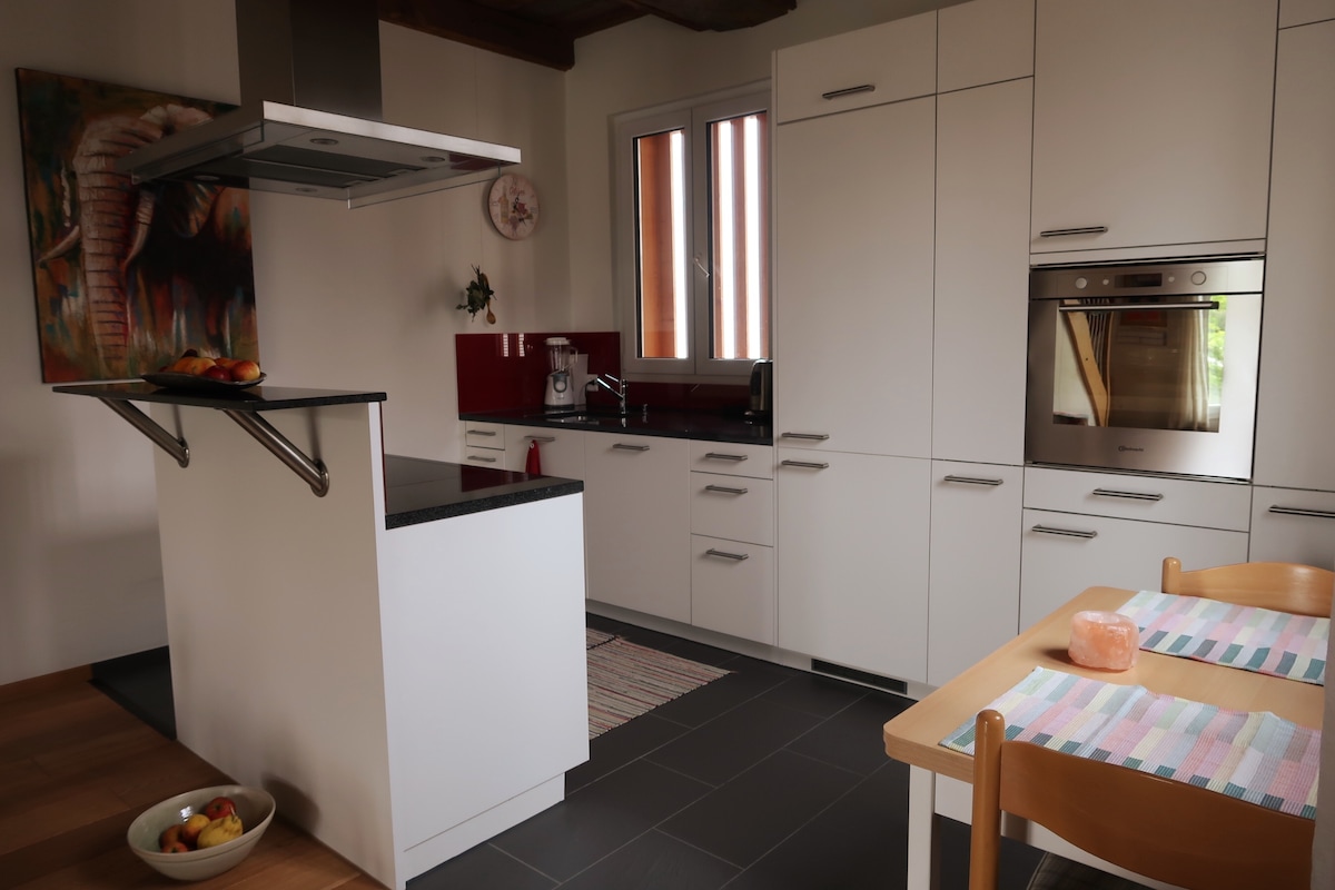 The guest apartment is on the lowest floor of a three storey family house (one family only) in a quiet neighborhood of an affluent municipality near the city of Zurich. The property is located on a hill (610m / 2000 ft) and offers from the garden nice views into the valley. The apartment's kitchen is very well equipped with everything you need. Parking is easy, on the property two outside parking spaces are availabe free of charge (one covered)