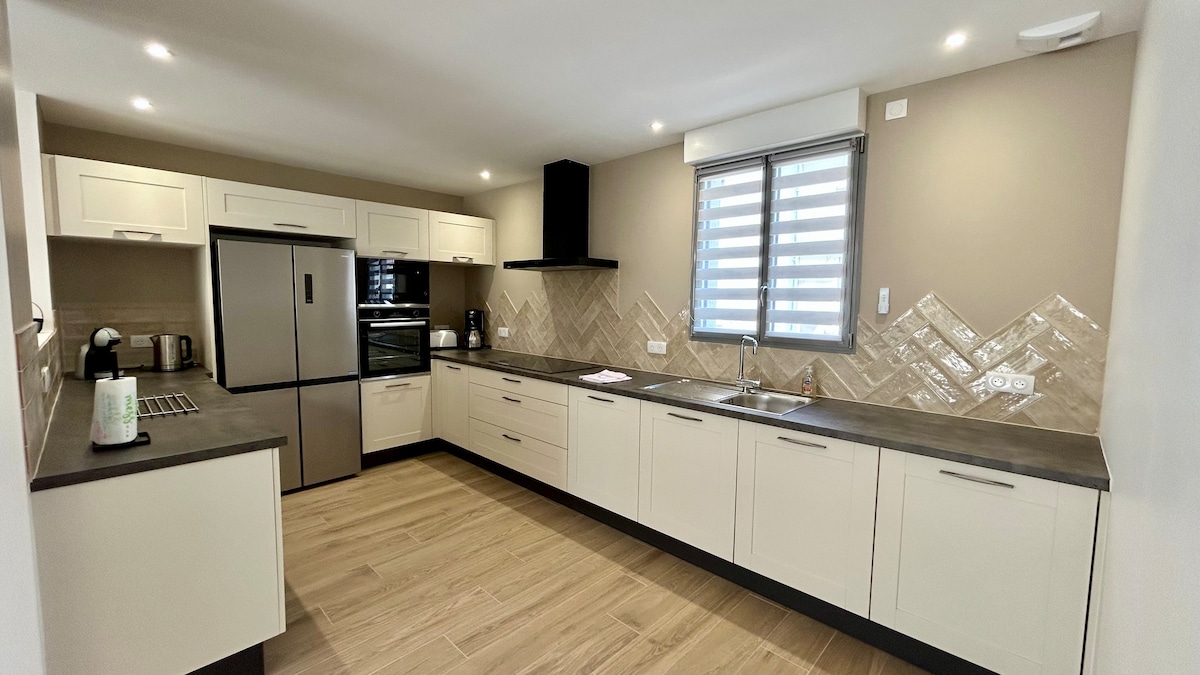 La Quiétude es una bonita casa de 50 m2 renovada donde vivir. Cocina totalmente equipada (horno, vitrocerámica, lavavajillas, lavarropa...) 2 dormitorios con cama doble 190x140, edredón 220 x240 y almohadas 65x65. No se proporcionan sábanas y toallas. A 400 metros del centro de la ciudad, a 600 metros de la playa y el puerto. Comercio a 100 metros ( Carrefour contact) Pequeño garaje y estacionamiento privado para 2 vehículos . Patio cerrado con terraza.