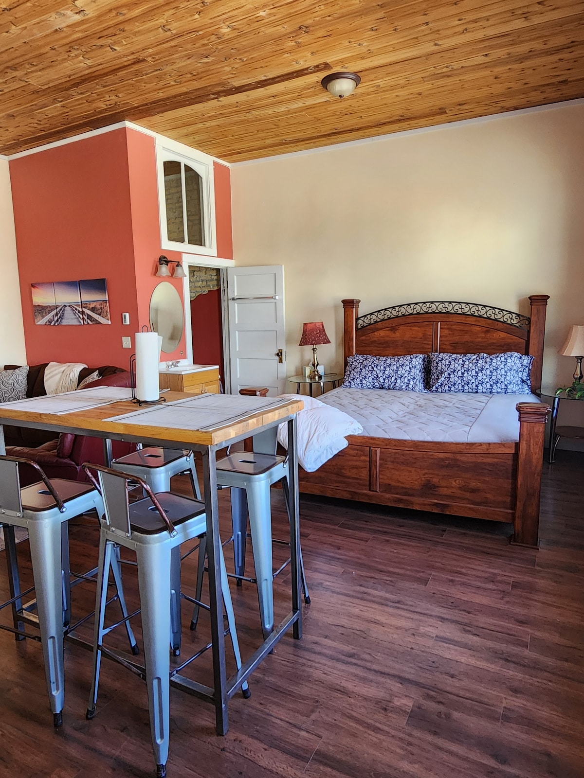 Disfruta de esta encantadora unidad privada de 1 dormitorio y 1 baño con capacidad para 4 personas. Esta elegante y cómoda suite ofrece todas las comodidades y extras junto con una cocina completa, barra de desayuno y baño completo. Un tema divertido ayuda a darle a esta unidad su propio carácter y estilo. Una zona de aparcamiento privado en la parte delantera y una entrada privada son parte de las atracciones de estas unidades para que los huéspedes puedan ir y venir con privacidad. El dormitorio ofrece un colchón tamaño California king con ropa de cama de alta calidad para dormir bien por la noche.