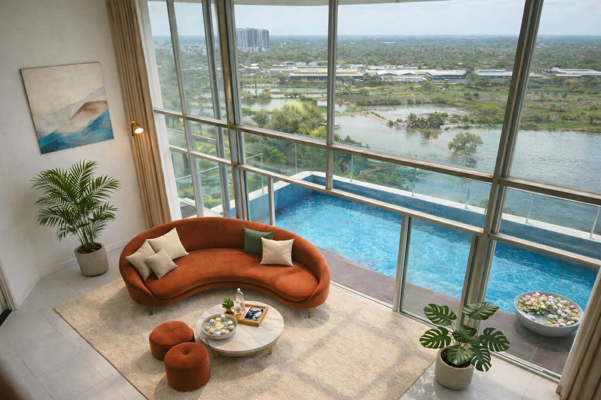 Escape to a chic Saigon sanctuary in this massive 285 m² duplex—perfect for families and groups. Dive into your PANORAMA PRIVATE POOL with open and unobstructed landscape view, unwind in the cozy home-cinema, and relax among stunning mid-century furniture hand-curated by the homeowner. This duplex was thoughtfully designed for a true home-away-from-home feel, located just 20 minutes from District 7’s vibrant heart—an irresistible blend of space, style, and value for your next Airbnb escape!