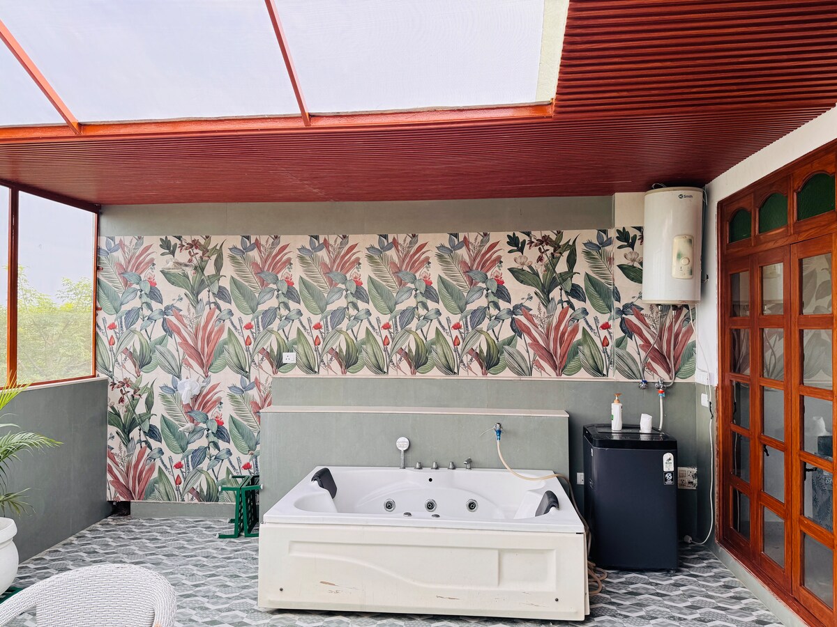 ¿Quieres relacionarte con familiares, amigos o compañeros de trabajo en plena naturaleza en Nueva Delhi? ¿Quieres experimentar la mezcla ideal de encanto y hospitalidad del viejo mundo con todas las comodidades modernas? ¿Deseas dar un paseo por los extensos jardines bajo los árboles frutales o esperar a ver pavos reales? Si la respuesta es SÍ, entonces este apartamento independiente de 3 dormitorios de la villa Shiv Niwas, con balcones privados y terraza en la azotea, cerraduras inteligentes, wifi de alta velocidad en toda la propiedad, aparcamiento gratuito y cuidadosas cocineras, ¡TE ESTÁ ESPERANDO!