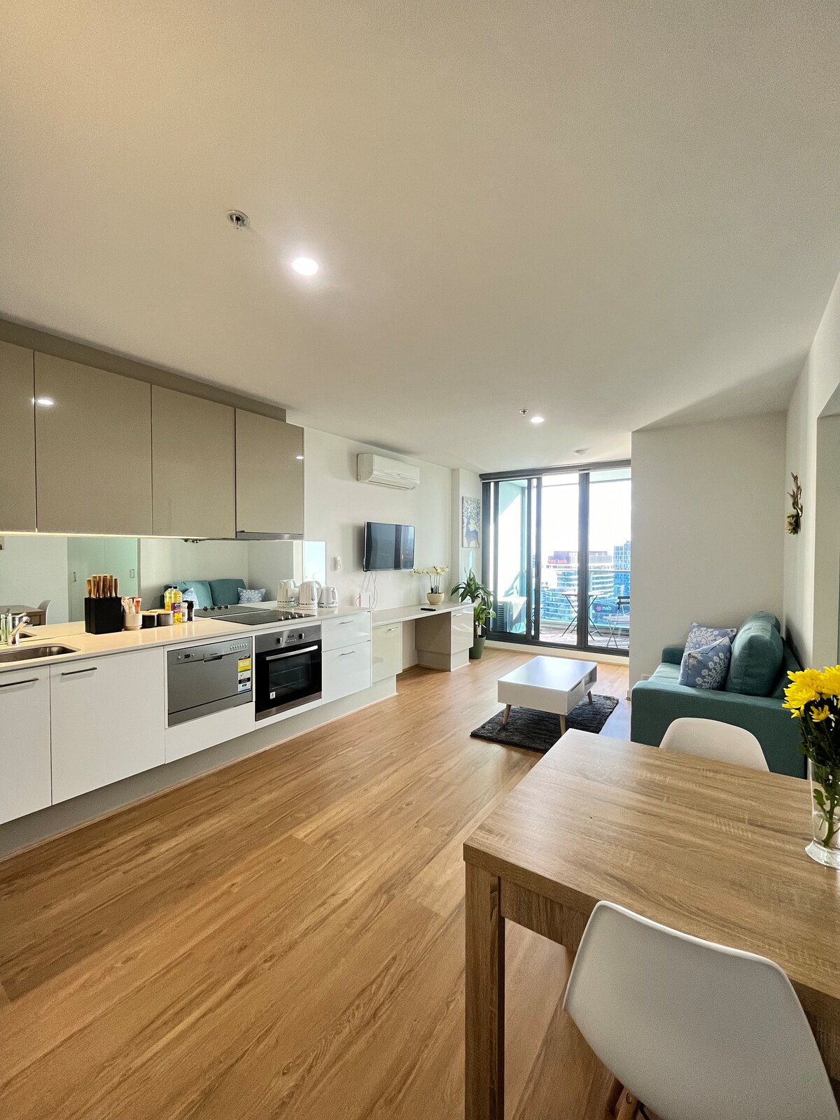 Entra para ser recibido por una sala de estar de planta abierta adornada con elegantes muebles de madera y detalles industriales. Los techos altos y las grandes ventanas inundan el espacio con luz natural, creando un ambiente cálido y acogedor. Pasea afuera hasta nuestro gran balcón con amplio espacio para que la familia se mezcle. El centro comercial District está a un tiro de piedra y ofrece supermercados, restaurantes, tiendas y entretenimiento. El frecuente servicio de tranvía en la planta baja te conecta con el resto del vibrante CBD.