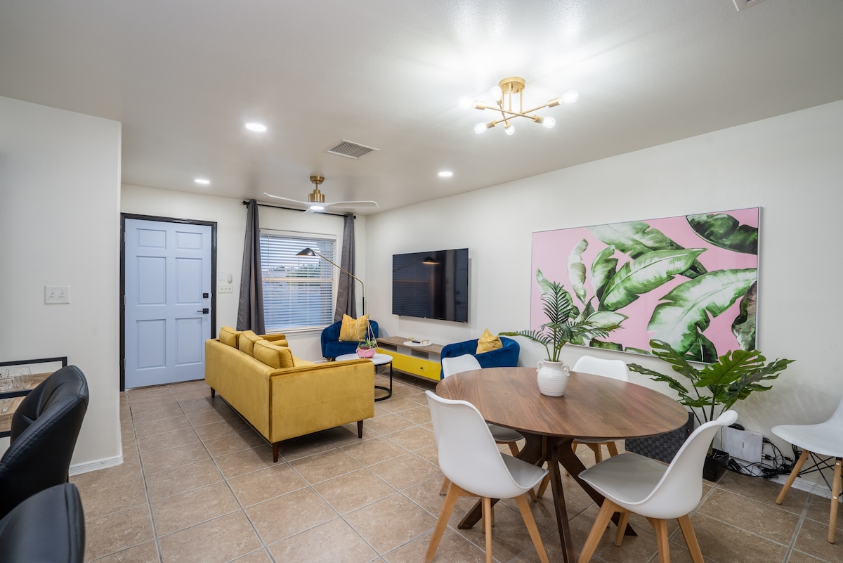 Este 1 dormitorio y 1 baño con cama tamaño queen y sofá cama es un lugar perfecto para aterrizar, ya sea que estés en Las Cruces para una exposición de perros, senderismo impresionante o para ir al Monumento Nacional White Sands. Totalmente renovado con una nueva cocina completa y equipada, con lavavajillas y estufa de gas, lavadora/secadora en la unidad, patio trasero privado con valla de madera de 6 pies, parrilla y patio que es perfecto para cocinar en nuestro increíble clima. Amplia cocina/comedor y sala de estar con un sofá cama extraíble con colchón de aire.