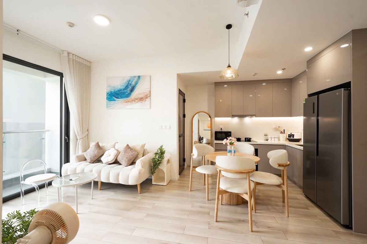 Apartamento de un dormitorio de estilo japonés - Vinhomes Grand Park Apartamento de 1 dormitorio de diseño japonés minimalista, sofisticado y acogedor. Espacio abierto con una sala de estar luminosa, una cocina totalmente equipada, un dormitorio privado y un balcón fresco para relajarse. Puedes apuntarte a una experiencia de campo de golf de alta gama (con tarifa) y a un moderno parque acuático en la zona urbana. Cerca de Vincom Mega Mall, el lugar más grande para comprar, comer y entretenerse en el sur.