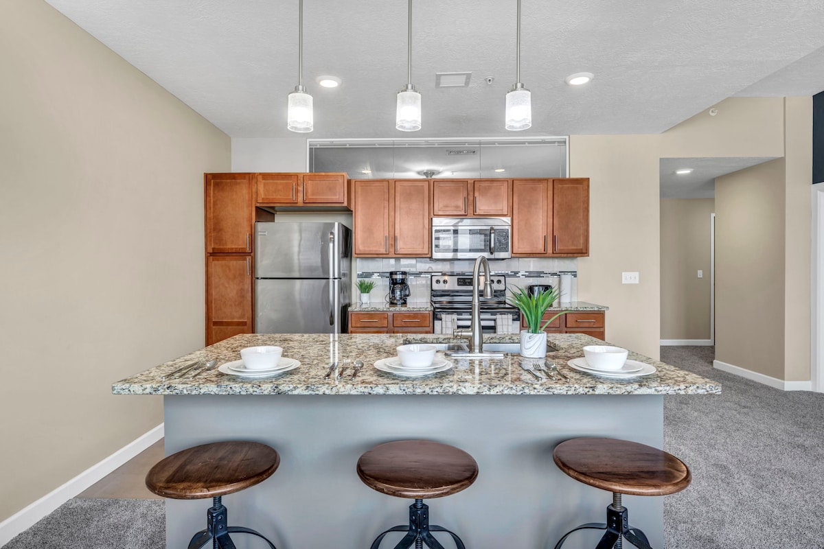 You can stop your search now. You just found the perfect place to book for your trip to Cleveland. ➹ Clean. Robust Amenities. Modern Finishes. Quick Host Responses. ➹ You're going to be located at the CENTER of everything in Downtown Cleveland. ➹ Get a good night's sleep with our memory foam beds. ➹ Spend your daytime working from home at our private home office. Cook a meal for your group in our beautiful, timeless kitchen. Then spend your evenings relaxing with our 65" Smart TV.
