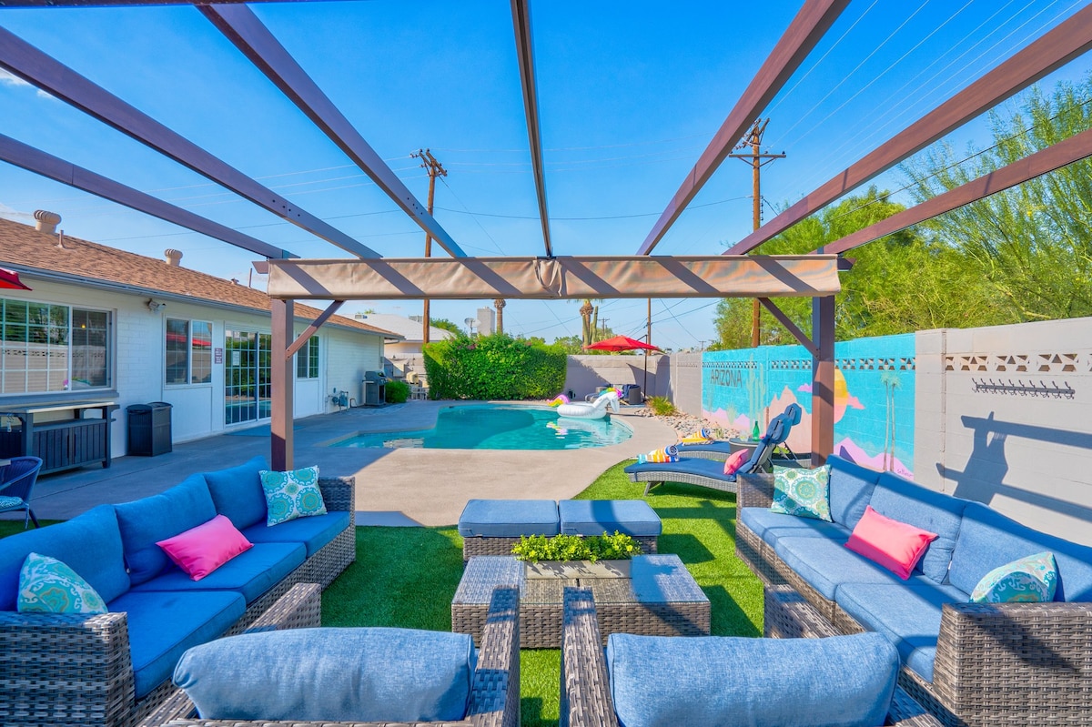 Retiro ✨ recientemente remodelado en Scottsdale – ¡Piscina, spa y ubicación privilegiada! ✨ Con 5 dormitorios + 2 baños (más 2 colchones de aire), esta espaciosa escapada tiene capacidad para 12 huéspedes cómodamente. Relájate en tu nueva piscina privada y spa con sistema de altavoces al aire libre, o sal a explorar, estás a solo minutos del casco antiguo de Scottsdale, el zoológico de Phoenix, Fashion Square y más. Perfecto para escapadas familiares, viajes de golf o vacaciones en grupo.
