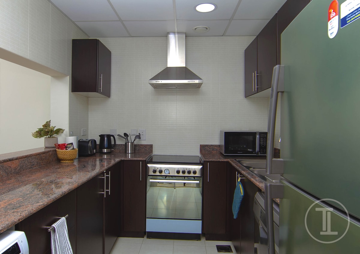 Este lugar está destinado a dejarte con los ojos abiertos de maravilla. Es como si la fuente bailarina te estuviera invitando a relajarte, todo mientras el Burj Khalifa te guiaba juguetonamente. ¿Y sabes qué es aún mejor? Disfruta de tu té en el balcón privado mientras disfrutas de esa increíble vista. ¡Pero espera, hay más! Este elegante lugar está decorado con elegantes electrodomésticos en el salón, la cocina y los dormitorios, lo que hace que tu estadía sea súper cómoda. Y como bonificación genial, hay una piscina y un gimnasio para colmo.